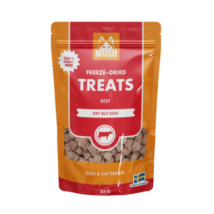 MUSH frysetørrede godbidder okse 55 g. er fremstillet af højkvalitets nordiske råvarer.